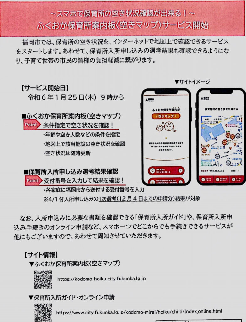 本日より福岡市では、スマホで保育所の空き状況が確認できるようになりました。