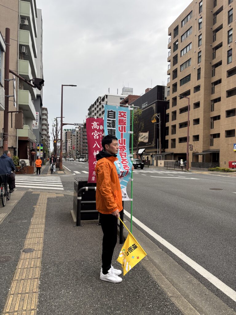 今朝の朝活は辻立ちの代わりに、春の全国交通安全運動に合わせた「自転車マナーアップ」運動。